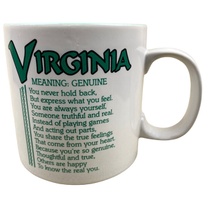 Features the name VIRGINIA printed in a large font at the top of the front side of the mug. Directly underneath this is a poem about the name VIRGINIA.