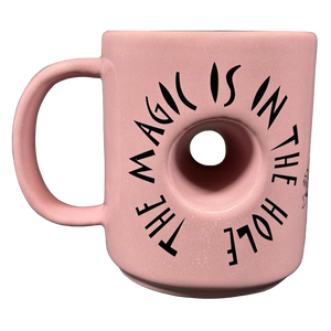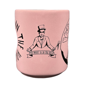 Finally on the side opposite the handle there is an illustration of a man with the same "THE MAGIC IS IN THE HOLE" printed on a banner beneath him.