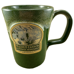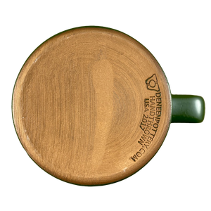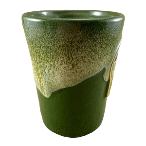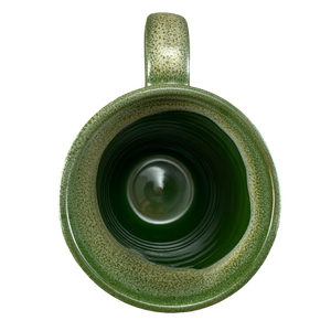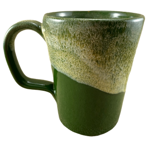 This is a gorgeous hand thrown mug that has a beautiful finish in several shades of green and tan that extends on to the handle and the interior.