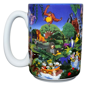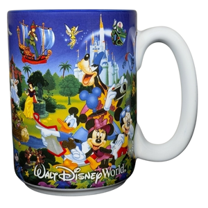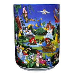 Features colorful artwork wrapping around its exterior surface depicting many Disney characters including: