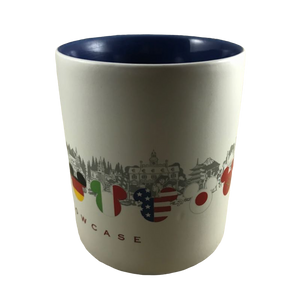 It features the shape of Mickey Mouse's head repeating 11 times around the exterior surface with the flags of a different country inside each one.