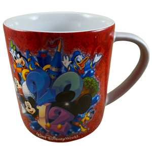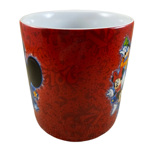 Features artwork wrapping around its exterior surface depicting many Disney characters.