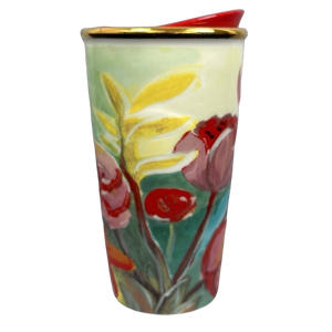 This beautiful tumbler features colorful watercolor floral artwork wrapping around its exterior surface.