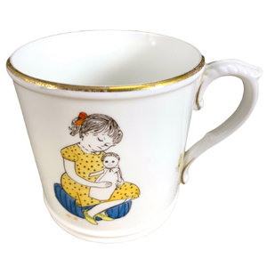 Artwork on its front surface depicts a young girl holding a doll while sitting on a blue cushion.