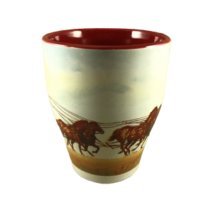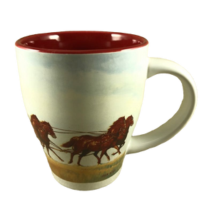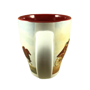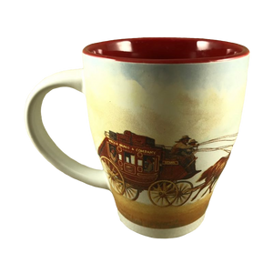 Features a Wells Fargo & Company stagecoach being pulled by horses encircling this mug.