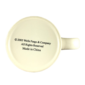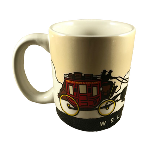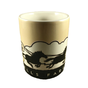 Features artwork encircling the exterior surface consisting of a red stagecoach being pulled by 3 horses. On the top of the stagecoach in yellow lettering is "Wells, Fargo & Company."