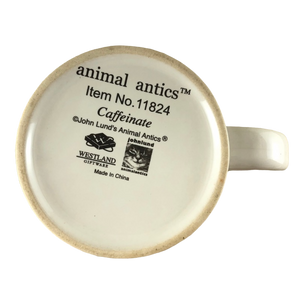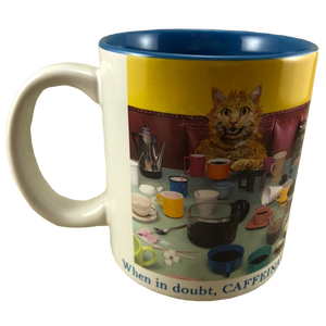 This humorous mug features the same artwork on its front and rear surfaces. This artwork depicts a frazzled looking cat sitting at a table holding a cup of coffee. Surrounding the cat on the table are dozens more cups of coffee.