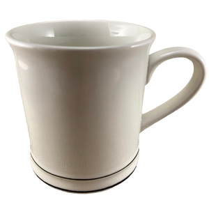 This mug has a gently flared rim and a slightly footed base with 2 thin rings of black trim wrapping around it.
