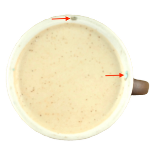 Condition note: there is a dark spot and some extra ceramic material with a green tint on the bottom rim. Please see the red arrows pointing to these imperfections in the last photo.