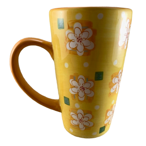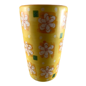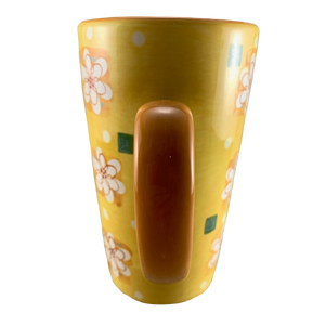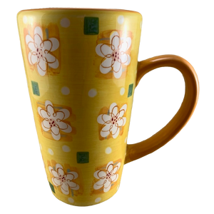 It features white flowers wrapping around its exterior surface with a yellow background behind them. There are green squares and white circles scattered in the background.