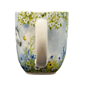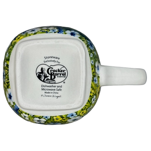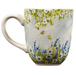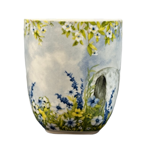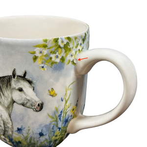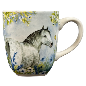 Features beautiful artwork wrapping around its exterior surface depicting a white horse among flowers.