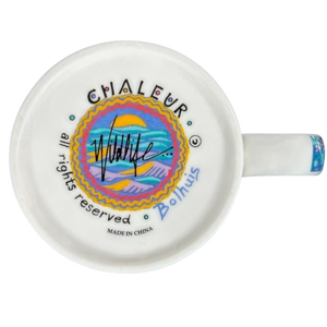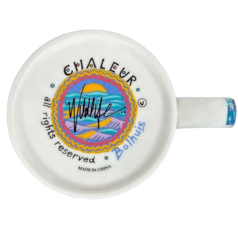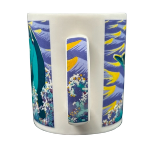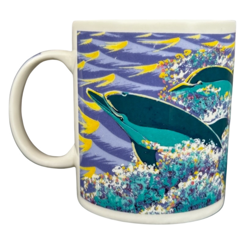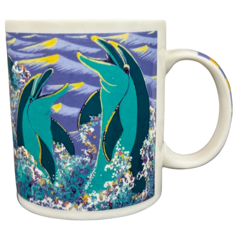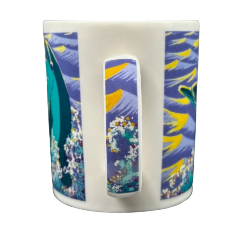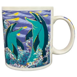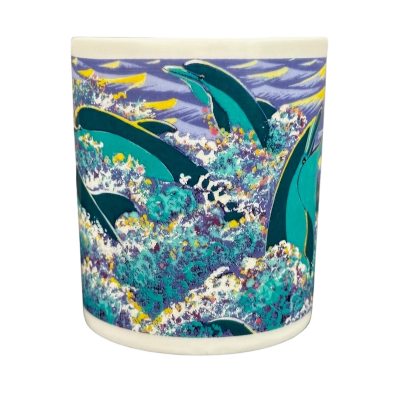 Features beautiful vibrant colorful artwork wrapping around its exterior surface and on the handle that depicts dolphins in the ocean.