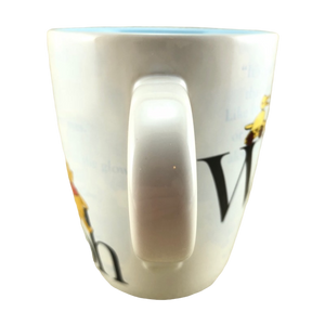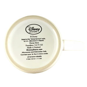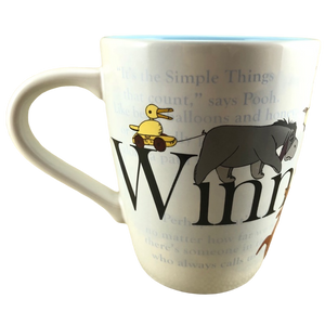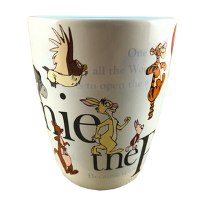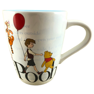 This super fun mug features all of your favorite Winnie The Pooh characters wrapping around its exterior surface walking together. The characters include Tigger, Piglet, Rabbit, Eeyore, Roo, Owl, and Christopher Robin. Christopher Robin is holding a red balloon.