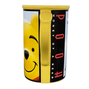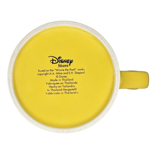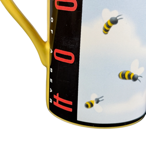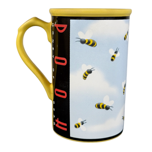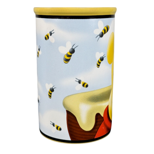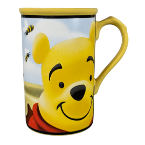 Surrounding Winnie and wrapping around much of the exterior surface are bees flying against a blue sky with clouds background.