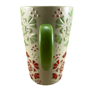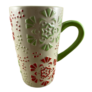 Features green and red embossed snowflakes wrapping around the exterior surface.