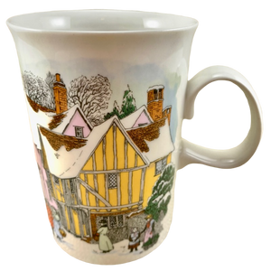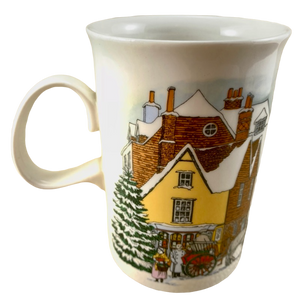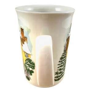 Artwork wrapping around the exterior surface of this mug depicts a winter village snow scene.
