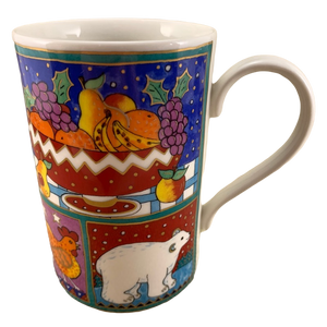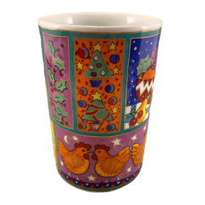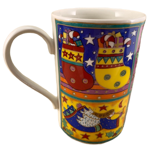 Features colorful Christmas related artwork wrapping around its exterior surface.