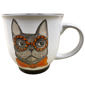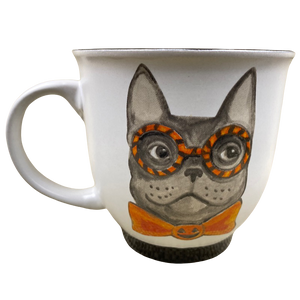 Features the same artwork on the front and rear surface consisting of a French Bulldog wearing orange and black glasses and an orange and black bowtie.