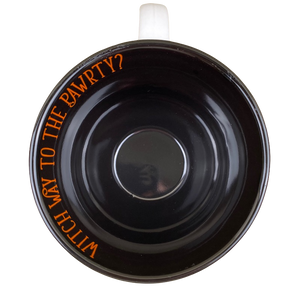 Printed inside on the rear upper surface in an orange font: "WITCH WAY TO THE PAWRTY?"