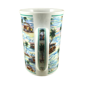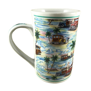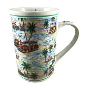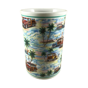 Features artwork wrapping around the external surface consisting of Woodie cars, surfers holding surfboards, clouds, and palm trees.