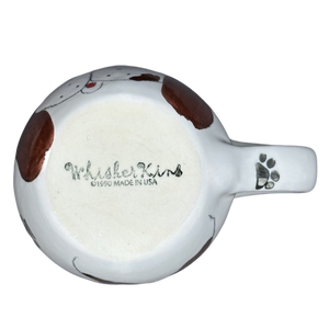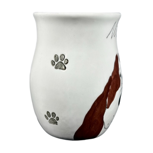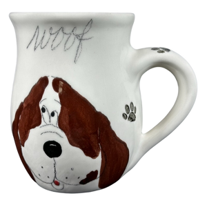 This adorable mug features a dog's face on its front surface and its hind quarters on the rear surface.