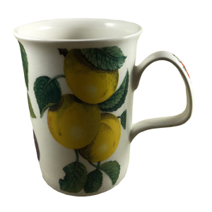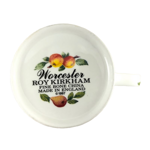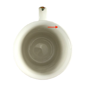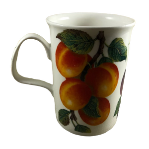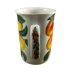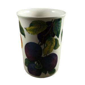 Condition note: there is a small nick on the rim near the handle, please see the 5th photo where a red arrow is pointing to the location of this. There are a few white dots on the peaches, please look carefully at the 3rd photo.