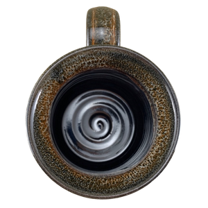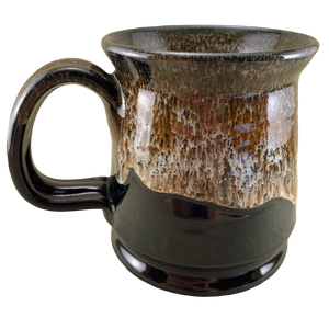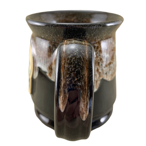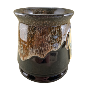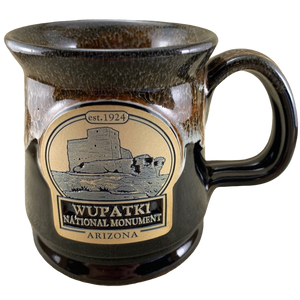 This is a hand thrown mug that has a gorgeous drip glaze finish. It features a raised plaque on its front surface with an image of the Wupatki National Monument lightly etched into it and the following text etched below it: