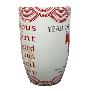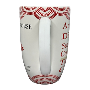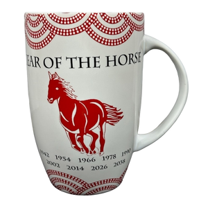 This is a tall mug that features artwork on its front surface depicting the YEAR OF THE HORSE.