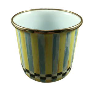 Features yellow and blue vertical stripes and a black and white checkered pattern wrapping around its exterior surface.