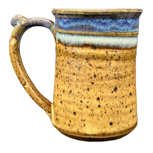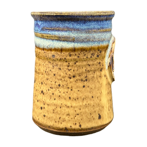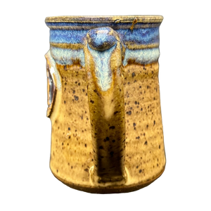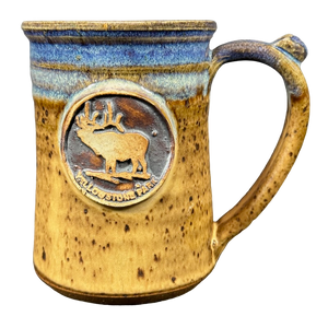This is a beautiful pottery mug that features a raised plaque on its front surface.