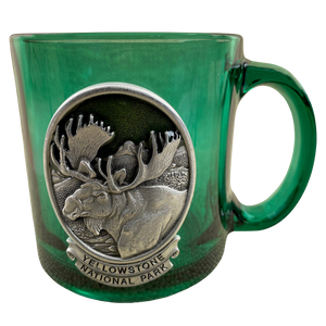 This mug features a pewter plaque on its front surface with an image of an embossed moose on its front surface.