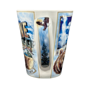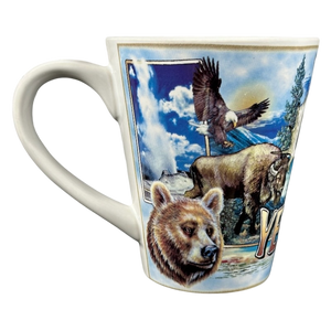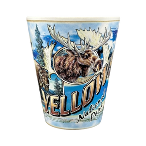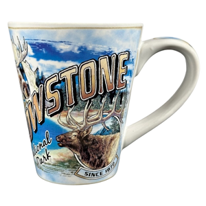 Features colorful artwork wrapping around its exterior surface depicting many scenic and animal images relating to Yellowstone National Park.
