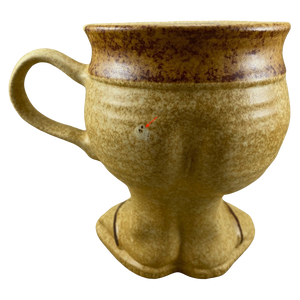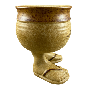 It is pottery style (though I can't be certain if it genuinely is) and shaped like the legs and feet of a person.