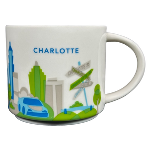 CHARLOTTE is printed on the front upper surface horizontally and STARBUCKS is printed on the rear left side vertically near the handle.