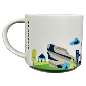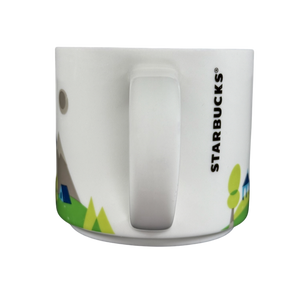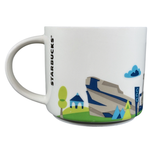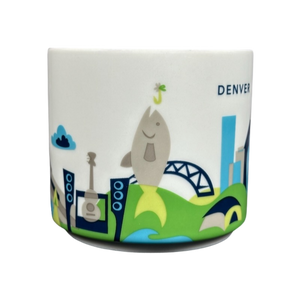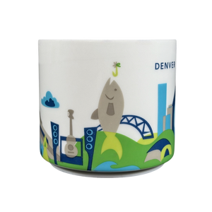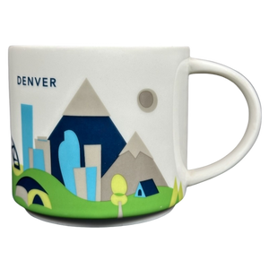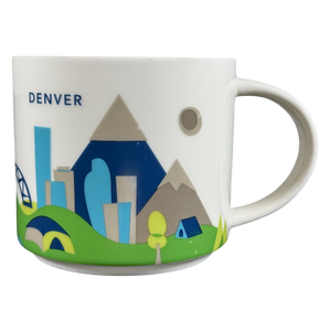 DENVER is printed on the front upper surface horizontally and STARBUCKS is printed on the rear left side vertically near the handle.