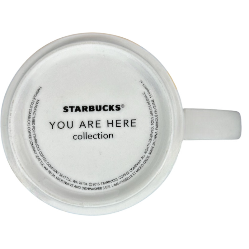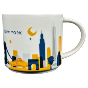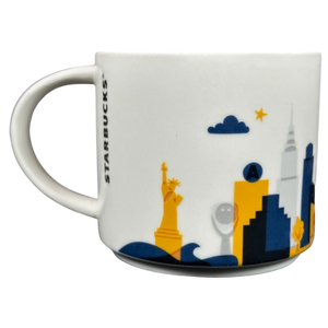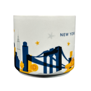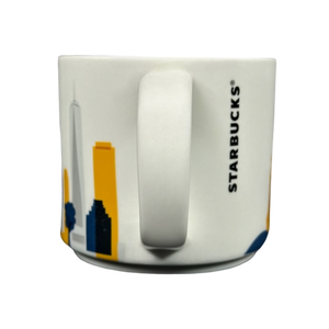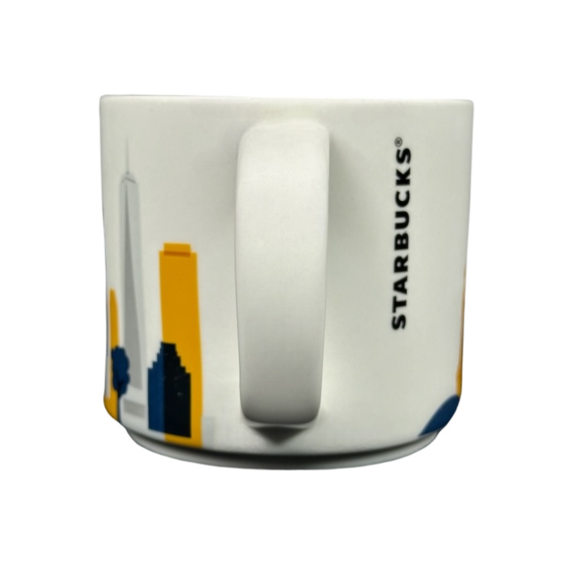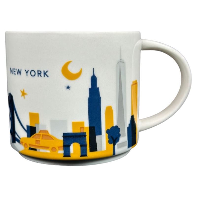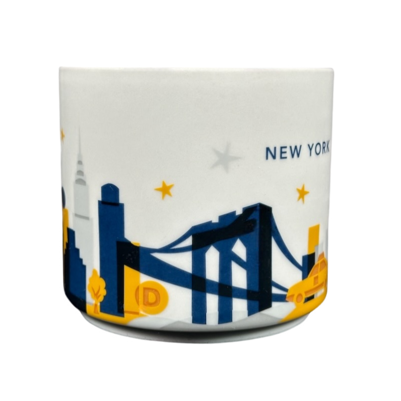 NEW YORK is printed on the front upper surface horizontally and STARBUCKS is printed on the rear left side vertically near the handle.