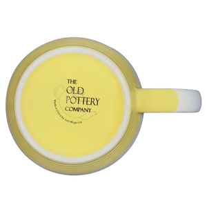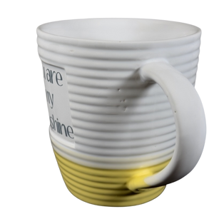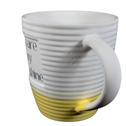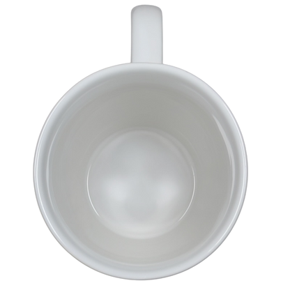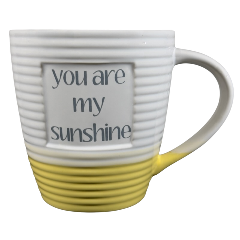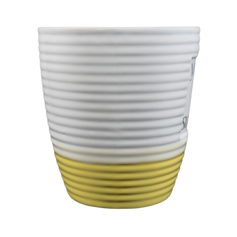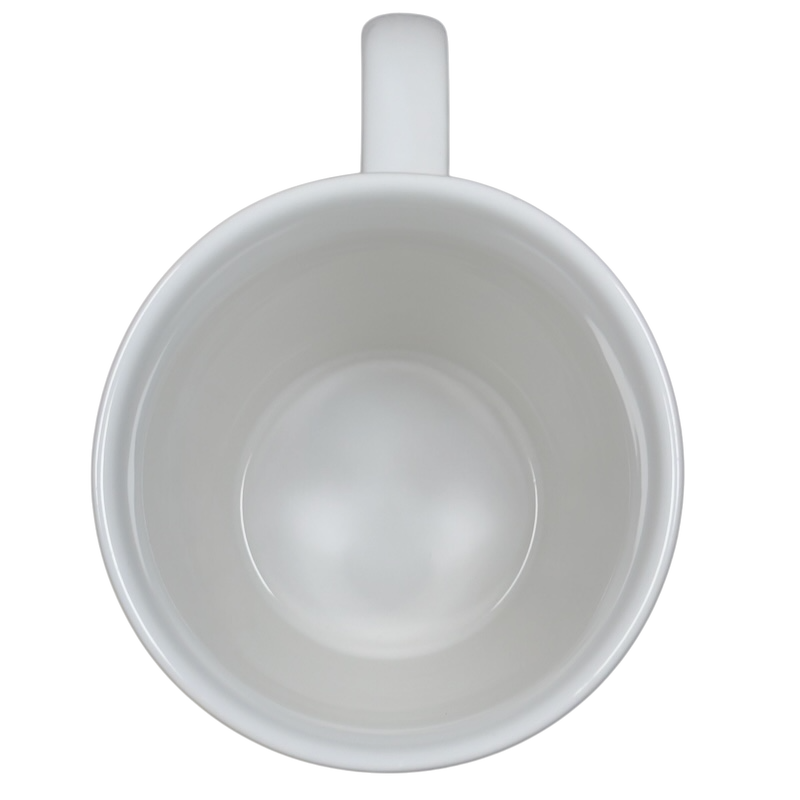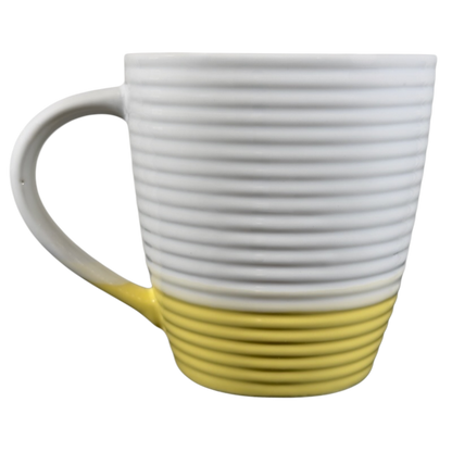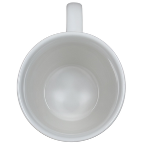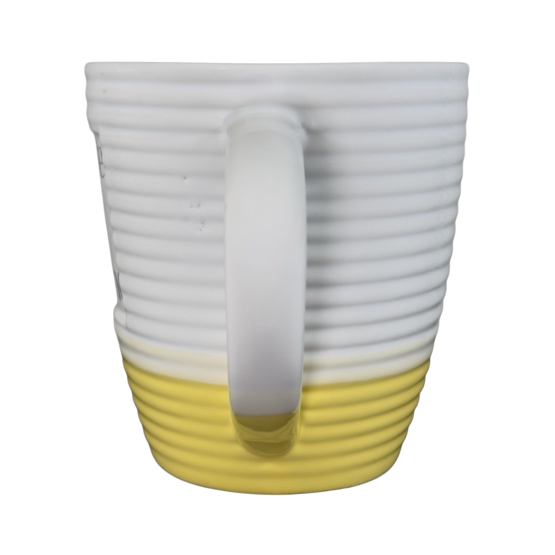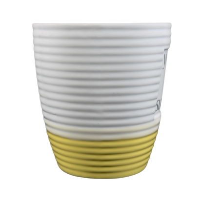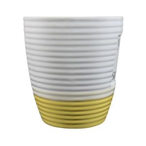 This is an oversized mug with a ringed texture that features a recessed square area on its front surface with the following printed inside it: