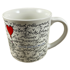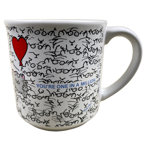 Features a gray cat with pink ears holding a red heart shaped balloon among a "million" other cats. Next to this cat is printed, "You're One In A Million"
